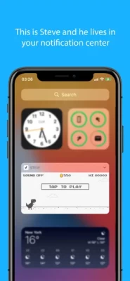Play with ‘Steve’ anytime, anywhere, by just dragging down from the top on your screen to reveal the notification center and your new dino-friend will be there waiting for you! Thanks to an intuitive and easy touch control anyone will enjoy with our unique characters in this AMAZING WIDGET! Jump and jump with only ONE FINGER. Our challenging environments have been designed like the old school arcade games, do you accept the CHALLENGE?