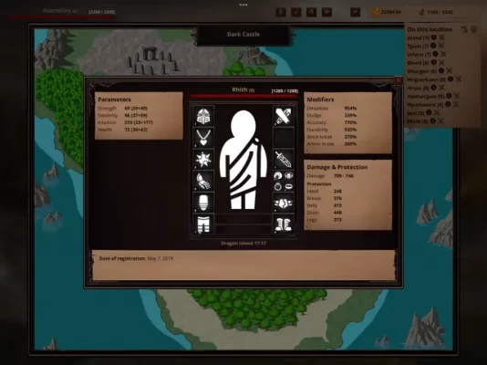 RPG in text style where you are given a hero located on the island, where he can move and fight. For the victory the hero gets experience, money and a thing.