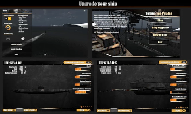 We are the the submarine pirates a small independent group in the Antarctic area. Our goal is reduce the military activity around our base and our oil-rigs . We have to protect our floating bases and oil resources to be able to survive. Everybody in the this area is a potential enemy and everybody want to get our resources. We have to clear up our area every day. The floating ice mountains changes everything on each day. Sometimes we have really hard time to accomplish our missions. Fortunately we have many secret technology in our hand like teleportation , doomsday device , hacking tools and shield technology to be able to fight against many enemy.