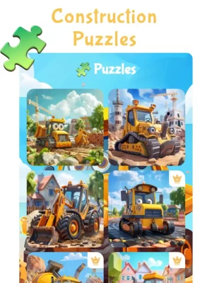 - 10 Real, high quality puzzles for 3 difficulty level with construction trucks, caterpillars and digger trucks