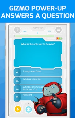 • THREE POWER-UPS – If a Bible trivia question has you stumped, you can call on the ever-comical Gizmo to help you answer it – this is when the real fun begins. The lifelines that Gizmo offers are: