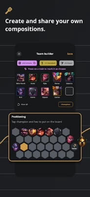 • Create your own TFT compositions and share them with your friends. Plan ahead strategies while playing the game with the composition builder, or theorycraft even if you’re not playing.
