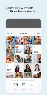 - Access to media and files via camera roll, iCloud, or Google drive