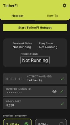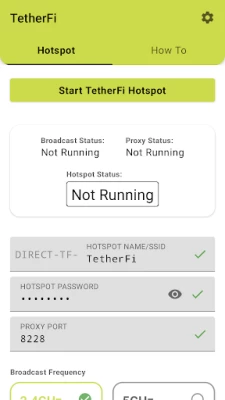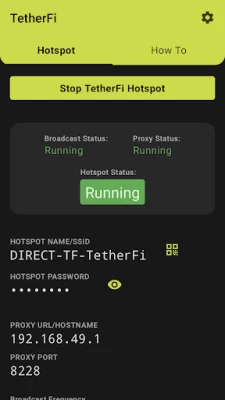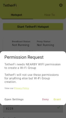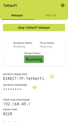 TetherFi works by creating a Wi-Fi Direct legacy group and an HTTP proxy server. Other devices can connect to the broadcasted Wi-Fi network, and connect to the Internet by setting the proxy server settings to the server created by TetherFi. You do not need a Hotspot data plan to use TetherFi.