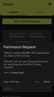 TetherFi uses a Foreground Service to create a long-running Wi-Fi Direct Network that other devices can connect to. Connected devices can exchange network data between each other. The user is in full control of this Foreground Service and can explicitly choose when to turn it on and off.