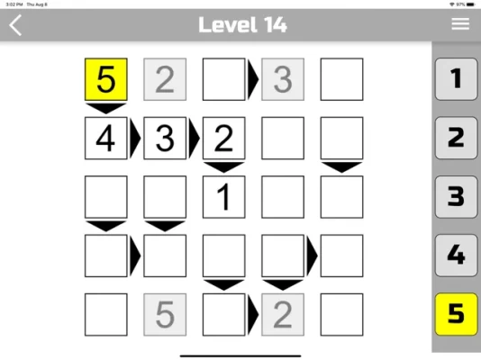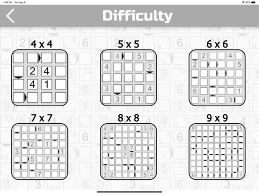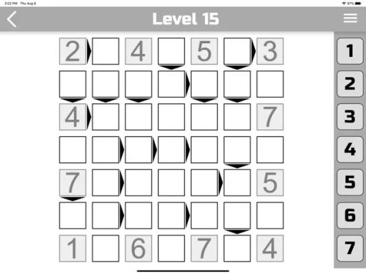 In the program you can choose 6 difficulty levels (4x4, 5x5, 6x6, 7x7, 8x8 and 9x9). The larger the square, the more difficult it is to go through. If you play Futoshiki for the first time, we recommend that you start with a 4x4 square. At each level of complexity you will be offered 2000 unique game levels. The higher the number the more difficult. (Level 2000 is the most complex).