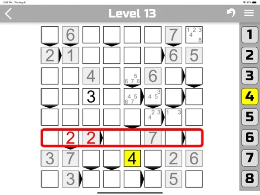 To change the value of a cell - first select it, and then click on the numbers at the bottom of the screen to put a number in the cell. You can put several numbers in one cell at once, but the level is considered passed, when in each cell there is only one number. If you want to remove a number from the cell, select it and click the corresponding number in the bottom of the screen.