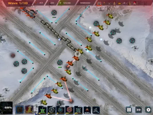 To defend against the robotic invaders, the player must strategically place defensive towers along the path of the enemy's advance. These towers can be upgraded to increase their range, power, and effectiveness, and can also be enhanced with special items that provide additional support.