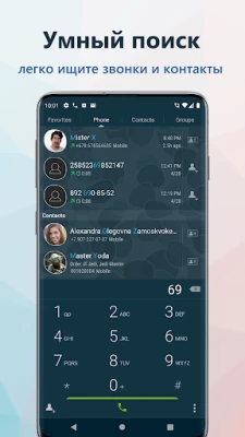 - Быстрый поиск по T9 среди истории звонков и контактов
