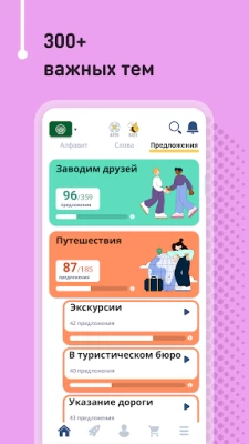• 1.250 арабских фраз (часто используемые): самые важные фразы для ежедневных разговоров и путешествий, поделенные на 7 уровней и 120 тем.