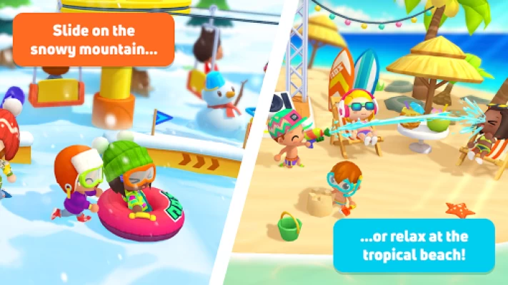 With so many locations, characters and objects you'll never run out of ideas for your endless stories. Have fun telling scary tales around the bonfire in a camping night at the forest, and then go to make a snowman on the ski slope, on your way back at the hotel the waiter will prepare a fruit shake while you relax in the pool and plan your next tour.