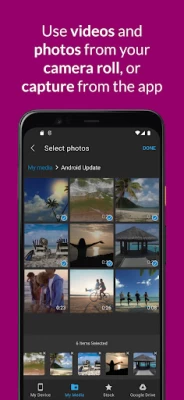 • Use videos and photos from your camera roll on your phone, or capture them from your camera
