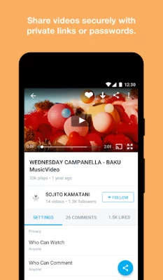 Upload gorgeous, ad-free videos HD, follow the world’s best creators, and discover amazing videos each and every day. No time to watch? Save videos for offline viewing. Wanna share on the go? Upload videos in the highest quality possible, right from your Android device.