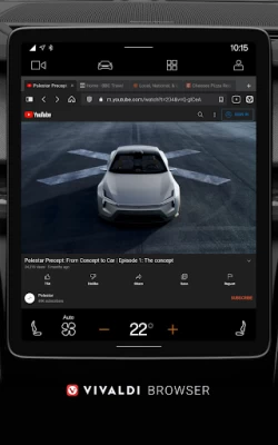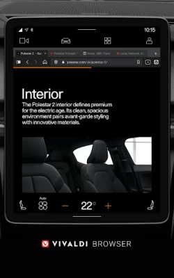Get a blazingly fast web browser for your Polestar. Vivaldi is a new, private web browser built with flexibility in mind. It comes packed with useful features including a built-in Ad Blocker, tracking protection, translation and Notes. Style the browser to your needs, using Themes and layout choices to help you feel at home. Vivaldi is your window to the web while you’re on the road.
