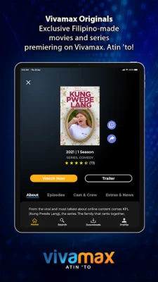 Here’s what you can do with Vivamax: 1. Stream all you want. Browse your favorite Pinoy content and stream them straight on your device. 2. Add titles to your Watchlist and binge on. 3. Save your data. Download Pinoy titles on your device and watch them offline anytime, anywhere. 4. Watch new titles and proudly Filipino made Originals, exclusive on Vivamax. Atin ‘to! 5. Enjoy uninterrupted viewing. Access the biggest library of Filipino content with no ad interruptions.