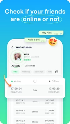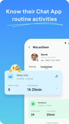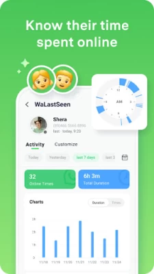 WaLastseen is a very powerful yet simple lastseen Messaging App tracker, and you will find it easier than ever to know the activity on Chat App, Chat App Business, and other apps. With Chat App tracker-WaLastseen, you can easily analyze in depth the usage and daily patterns of the one you track and know their lastseen status even they hide their status in Chat App. ?