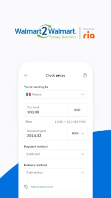 Say bye to checks or wiring money. Say hello to digital payment options. With the Walmart2Walmart Money Transfer Powered by Ria app, you can send money within the US and Puerto Rico, and from the US to Mexico.  Plus, our Send Again feature makes it easy to repeat transfers with a couple of taps.