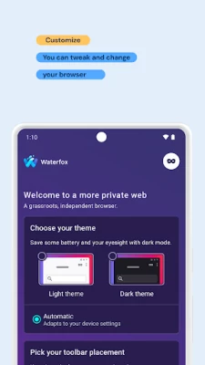 Give Waterfox a try to take control of your mobile browsing, you can browse the web privately.