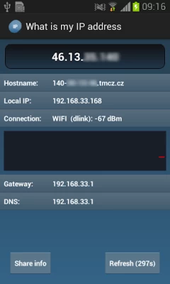 - external IP (IPv4 + IPv6) - hostname - local IP - gateway, DNS - (for wireless connection) signal strength graph