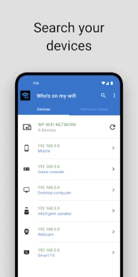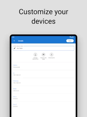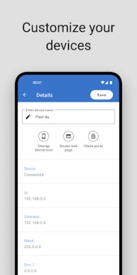 * Customize the name and icon of your devices. * Access to the router configuration web page. * History of devices and networks analyzed. * Export in csv, xml and json format. * Import backups in json format. * Tool to check open ports on found devices. * Shows devices connected and disconnected from your wifi network. * Displays device information such as hostname, ip address, gateway, netmask, dns. * Day and night mode. * Widget on home screen.