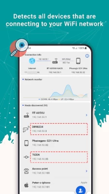 Features - Scans all WiFi network devices in seconds - Check who on my wifi / Detect wifi thief - Router Admin: 192.168.1.0 or 192.168.0.1 or 192.168.1.1 , etc - Ping tool - Port scanner - Network monitor - Router Password List - Gives you ip, device type - Vendor address database to find which vendor's device is connected - One-Click Quick Scan