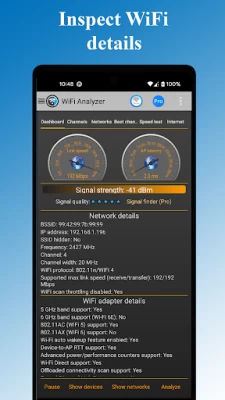✔ Detailed information about your network and your access point including the vendor of the Access Point, frequency, channel width, security level and DHCP info, BSSID (router MAC address).