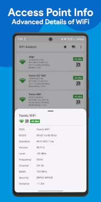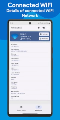 WiFi Analyzer is a user-friendly mobile application that scans and provides detailed information about nearby WiFi networks and access points. It allows you to monitor real-time data on your nearby WiFi networks, including SSID, BSSID (mac address), WiFi Standard, WiFi version, channel, frequency, WiFi signal level, width, WiFi security, and the distance to the access point. Additionally, the app enables you to discover the connected network information, such as IP address, subnet mask, gateway, DHCP server, DNS, lease duration, connected interface, link speed, and more.
