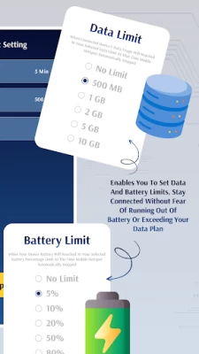 Set time limits, data limits and battery usage limits for Wi-Fi hotspot usage.