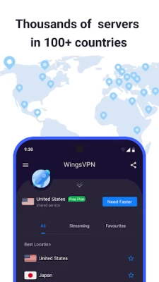 Utilize WingsVPN for blazing speeds and robust privacy. A simple tap on ""Quick Connect"" links you to one of our 1000+ servers in seconds, akin to traveling on a virtual express train!