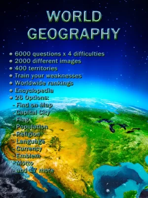 Features of World Geography - Quiz Game: ● 6000 questions x 4 difficulties ● Over 2000 different images ● 500 different countries, regions, and islands ● Train your weaknesses after every game ● Worldwide rankings ● Encyclopedia