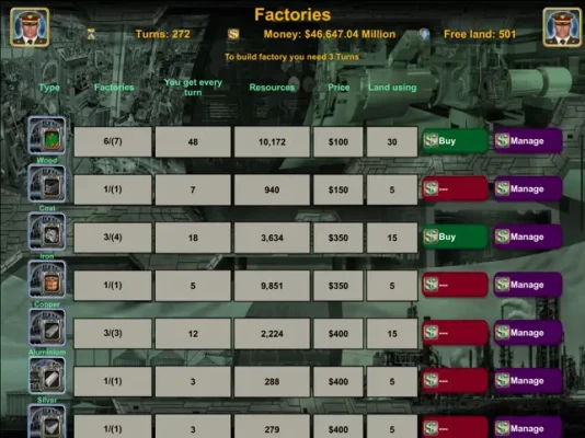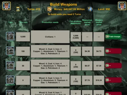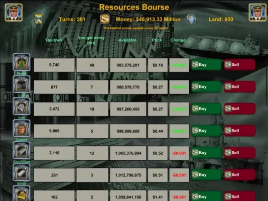 The game contains: Resources, Factories, Stock Exchange, Weapons Markets, Diplomats, Alliances, United Nations, a Spy Center, a War Room, an Economic System, Technology, World Events, World News and very advanced Artificial Intelligence.