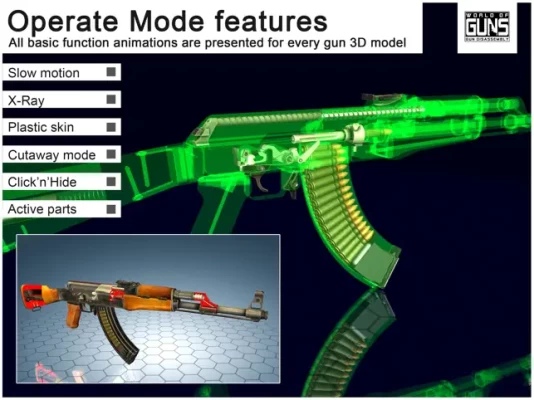 World of Guns has been used as a learning aid by armorers, law enforcement and military personnel. To create each model, our team spends months poring over actual guns, photos, blueprints and documents. Each part out of hundreds functions in a physically correct way – exactly as it does in a real thing. There are few ways to understand the different firearm actions and systems as clearly.