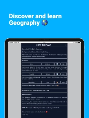 Terms of Use: https://www.apple.com/legal/internet-services/itunes/dev/stdeula/ Privacy Policy: https://github.com/Writer-Sonic/Worldle#worldlegeography-daily-puzzle