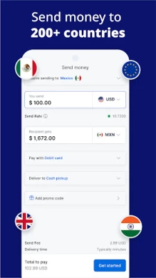 ● Transfer money in as fast as minutes to 200+ countries around the world.