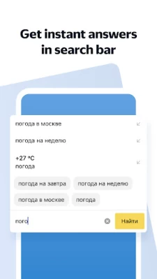 With Yandex Browser Lite you can: - Browse quickly, and save on your phone’s battery power and storage. - Find what sites you need or ask Yandex questions with the SmartBox search bar. - Go to your most visited sites from visual bookmarks from your main screen’s Tableau. Low on storage space on your smartphone? - Easily clear the cache and cookies right in Settings. - Store Yandex Browser Lite on either your memory card or your device.