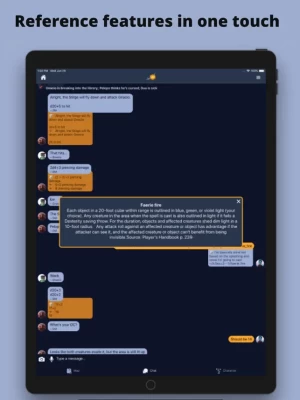 Chat: Roll dice, reply, react, send pictures, send sound recordings, and reference spells and class features with one touch.