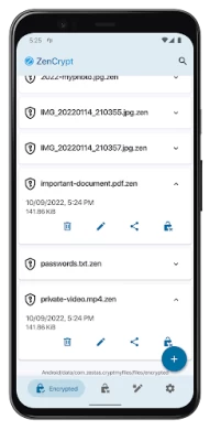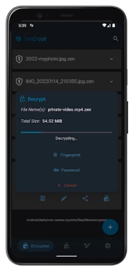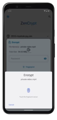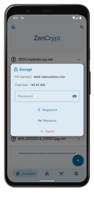 A: ZenCrypt supports encrypting using an alphanumerical password, or using a fingerprint, if your device supports it.