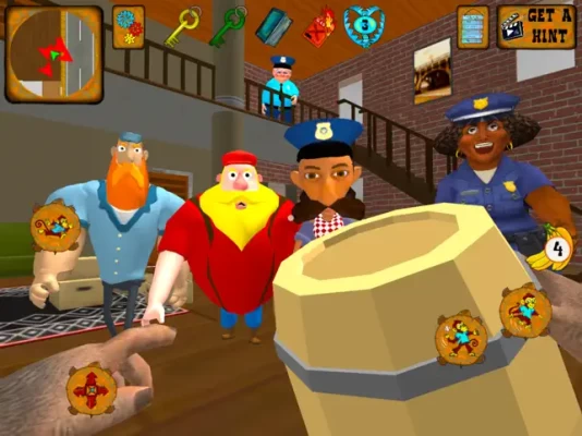 To perform all levels you will need to seek for various items. Collect and eat food to restore stamina. Collect and set traps to stun your neighbor enemies. Escape and hide from the guards under beds!